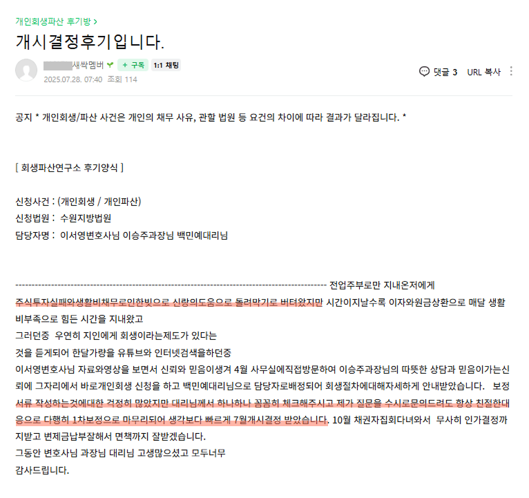 법률사무소 우인 개인회생 사건 진행