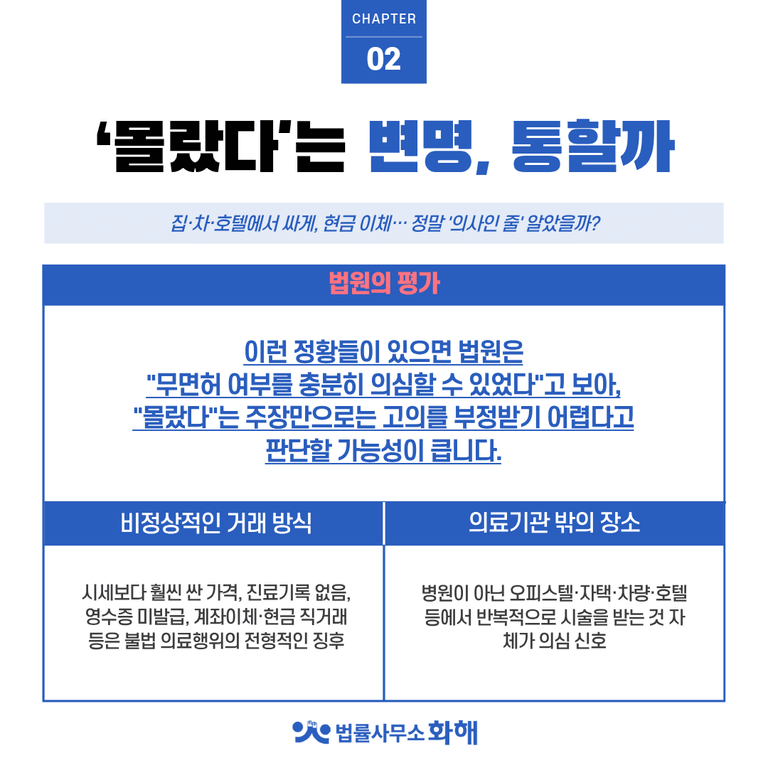 결국 '정말 속았는지', '언제부터 무면허라는 사실을 알았는지', '알고 나서도 계속 이용했는지'가 환자에게도 형사책임이 미칠 수 있는지 여부를 가르는 핵심 쟁점이 됩니다. 단순히 "몰랐다"는 말만으로는 법적 책임에서 벗어나기 어렵다는 뜻입니다.