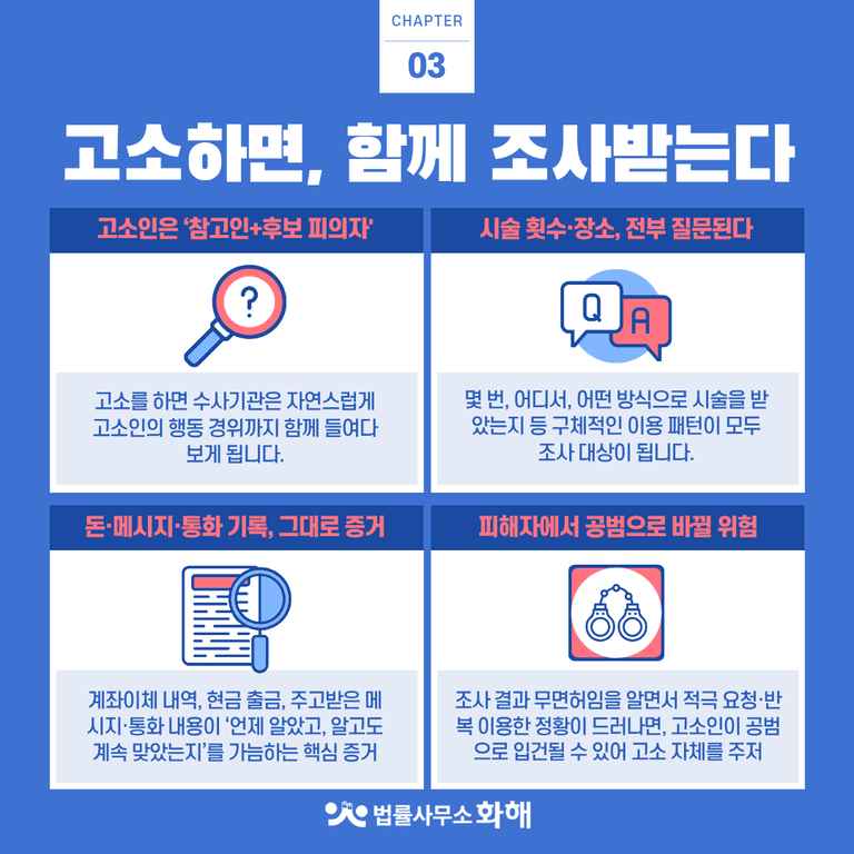 그렇다면 왜 연예인들은 '주사이모'를 고소하지 않을까요? 핵심은, 고소를 하는 순간 수사기관이 고소인의 행위 경위까지 전면적으로 들여다보게 된다는 점입니다. 고소인이라고 해서 예외가 되는 것이 아니라, 수사 과정에서 범죄 가담 정황이 드러나면 언제든 피의자 신분으로 전환될 수 있습니다.