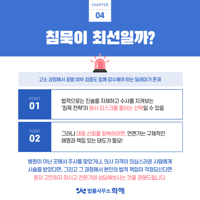 또한 이런 문제는 연예인들만의 이야기는 아닙니다. 만일 이 글을 읽고 있는 분들 가운데, 병원이 아닌 곳에서 주사를 맞았거나, 의사 자격이 의심스러운 사람에게 시술을 받았다면 그리고 그 과정에서 본인의 법적 책임이 걱정되신다면 혼자 고민하지 마시고 전문가와 상담해보시는 것을 권해드립니다.