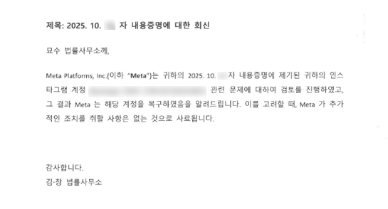 안형서 변호사는 다수의 플랫폼 계정 복구 사례에서 축적한 경험과 플랫폼 제재 구조에 대한 이해를 바탕으로, 계정 제재의 구체적 경위와 메타의 내부 기준을 면밀히 분석하였습니다. 그 과정에서 AI 자동 제재 시스템의 오판 가능성과 커뮤니티 가이드라인 적용의 불합리성을 짚어내며, 계정 복구의 필요성을 법적·논리적으로 담은 내용증명을 메타 측에 발송하였습니다.