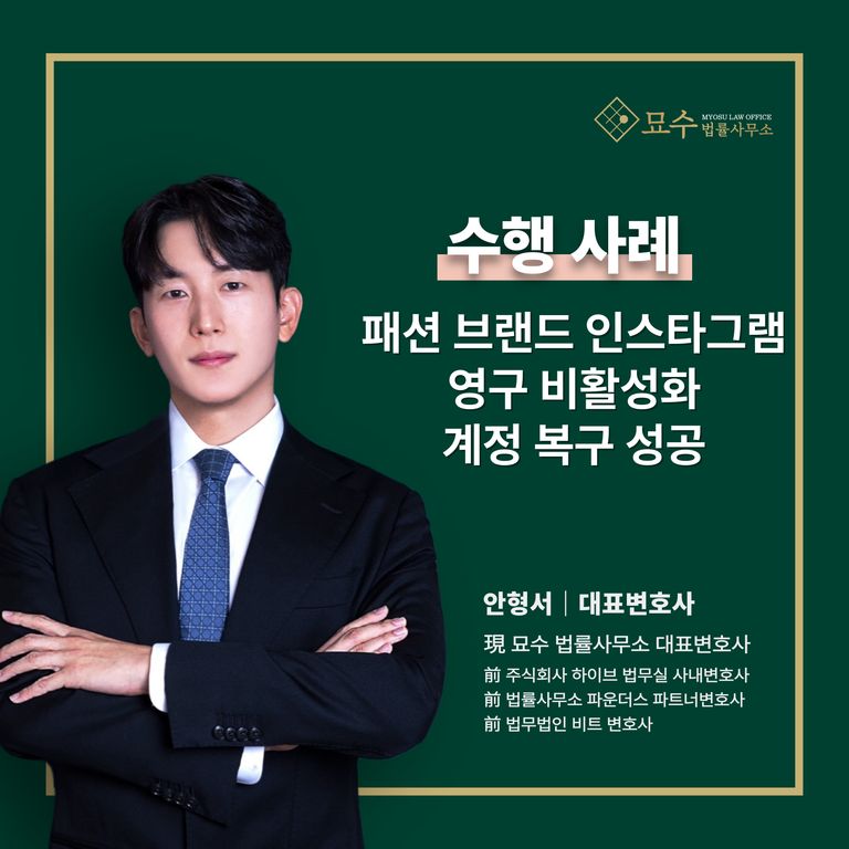 SNS 계정 정지로 인해 브랜드 운영, 매출, 신뢰도에 실질적인 타격을 입으셨다면, 플랫폼 대응 경험이 풍부한 안형서 변호사의 조력을 통해 신속히 계정을 되찾으시길 바랍니다.
