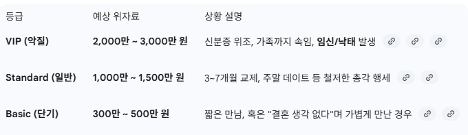 법원은 남자의 거짓말(기망) 수법과 기간, 그리고 당신이 입은 피해 정도에 따라 위자료를 책정합니다. 실제 판례 데이터를 바탕으로 견적을 뽑아봤습니다.