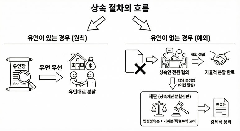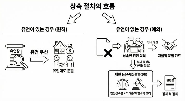 그러나 유언이 없거나, 유언이 있더라도 집행 과정에서 상속인 사이에 이견이 생기면 결국 상속재산분할협의가 핵심 절차가 됩니다.