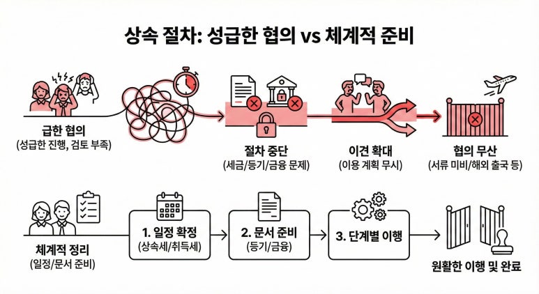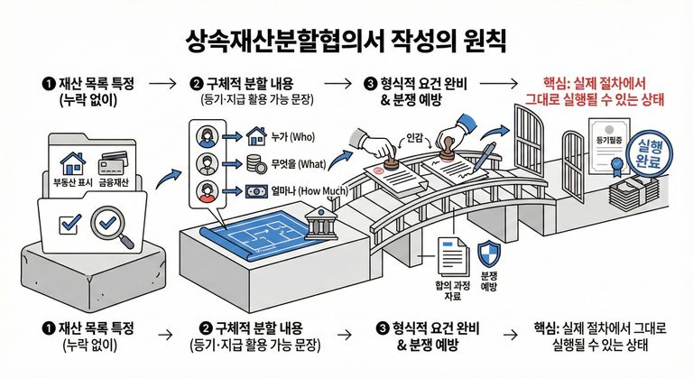 협의는 자율적으로 할 수 있지만, 그만큼 한 번의 실수로 분쟁이 길어지거나, 세금·등기·금융 인출 단계에서 다시 처음으로 돌아가는 일이 자주 발생합니다.