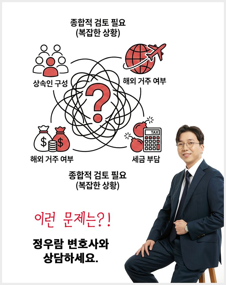 상속인 구성, 해외 거주 여부, 세금 부담까지 종합적으로 검토가 필요하다면, 정우람 변호사에게 상담주시기 바랍니다.