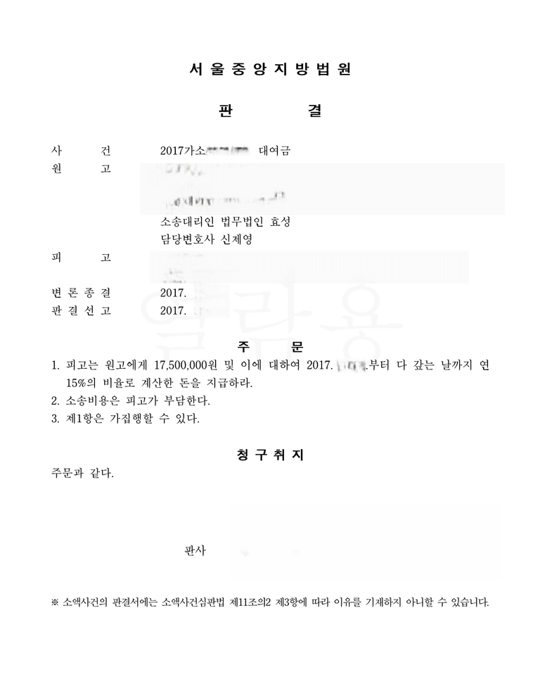 저는 즉각 민사소송 대여금청구를 하여 대여사실을 기타 증거(이체내역, 카톡, 문자, 통화녹음 등)로 주장 입증하였고 법원은 원고 승소 판결을 선고하여 의뢰인은 대여금을 변제받았습니다.
