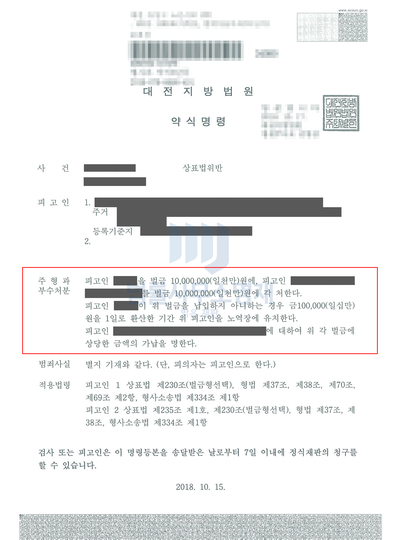 법원은 상표법 위반을 인정하고 해당 업체와 대표이사에게 각각 1,000만 원의 벌금을 선고하였습니다.