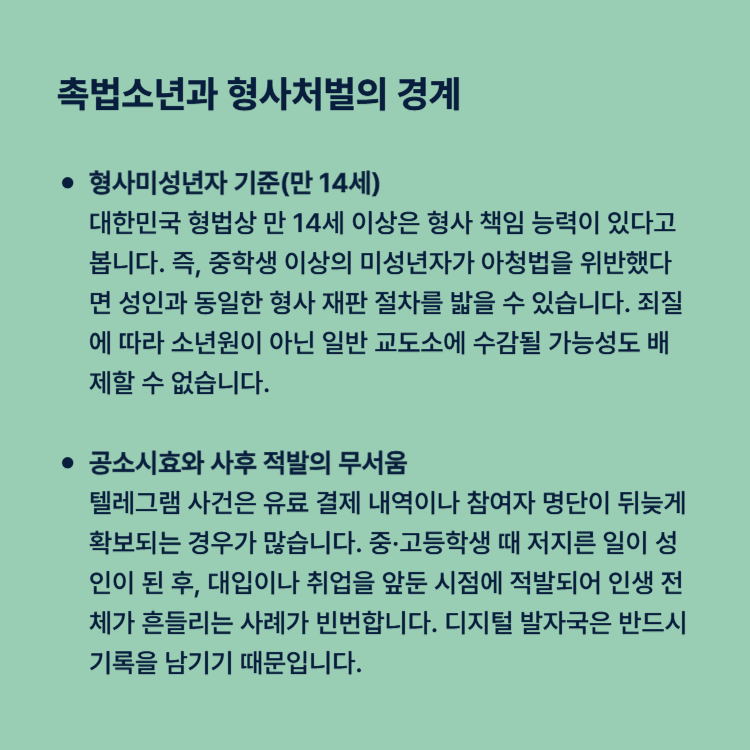 공소시효와 사후 적발의 무서움: 텔레그램 사건은 유료 결제 내역이나 참여자 명단이 뒤늦게 확보되는 경우가 많습니다. 중·고등학생 때 저지른 일이 성인이 된 후, 대입이나 취업을 앞둔 시점에 적발되어 인생 전체가 흔들리는 사례가 빈번합니다. 디지털 발자국은 반드시 기록을 남기기 때문입니다.