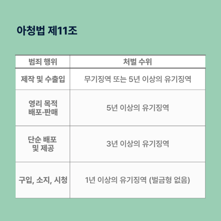 여기서 가장 주목해야 할 점은 단순 소지나 시청의 경우에도 '벌금형' 규정이 아예 없다는 것입니다. 혐의가 인정되면 원칙적으로 징역형의 선고유예나 집행유예를 다투어야 하는 상황입니다. 성인이 되어 적발될 경우 사회적 낙인은 물론 취업 제한 등 막대한 불이익이 따르게 됩니다.
