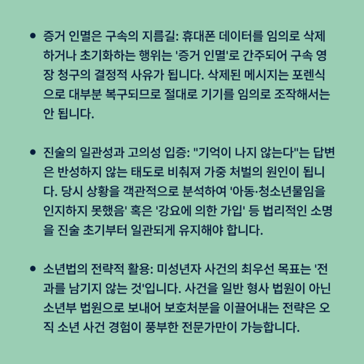 증거 인멸은 구속의 지름길: 휴대폰 데이터를 임의로 삭제하거나 초기화하는 행위는 '증거 인멸'로 간주되어 구속 영장 청구의 결정적 사유가 됩니다. 삭제된 메시지는 포렌식으로 대부분 복구되므로 절대로 기기를 임의로 조작해서는 안 됩니다.