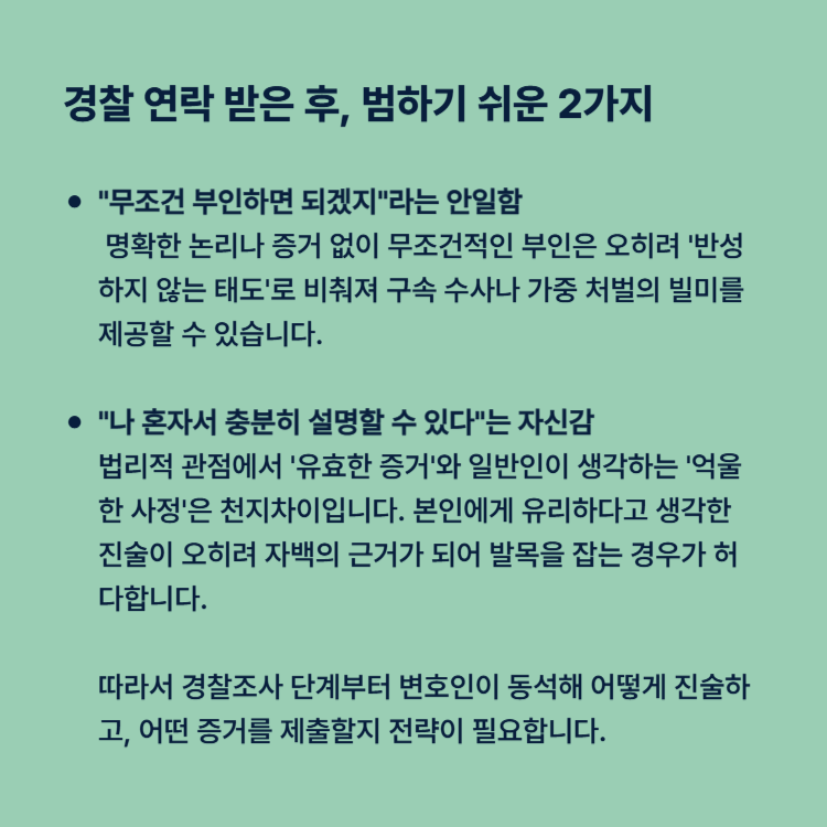 첫째, "무조건 부인하면 되겠지"라는 안일함: "나는 그런 적 없다", "상대방이 100% 거짓말을 하고 있다"며 감정적으로 혐의를 부인하는 것입니다. 하지만 명확한 논리나 증거 없이 무조건적인 부인은 오히려 '반성하지 않는 태도'로 비춰져 구속 수사나 가중 처벌의 빌미를 제공할 수 있습니다.
