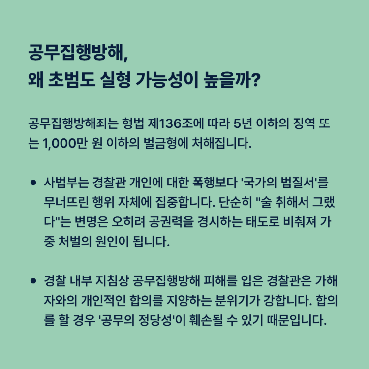 국가 기강에 대한 도전: 사법부는 경찰관 개인에 대한 폭행보다 '국가의 법질서'를 무너뜨린 행위 자체에 집중합니다. 따라서 단순히 "술 취해서 그랬다"는 변명은 오히려 공권력을 경시하는 태도로 비춰져 가중 처벌의 원인이 됩니다.