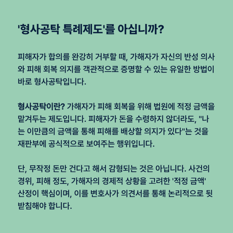 합의가 안 된다고 해서 길이 없는 것이 아닙니다. 형사공탁이라는 제도적 장치와 함께, 의뢰인의 유리한 사정을 하나하나 발굴해 줄 조력자가 있다면 결과는 충분히 달라질 수 있습니다.