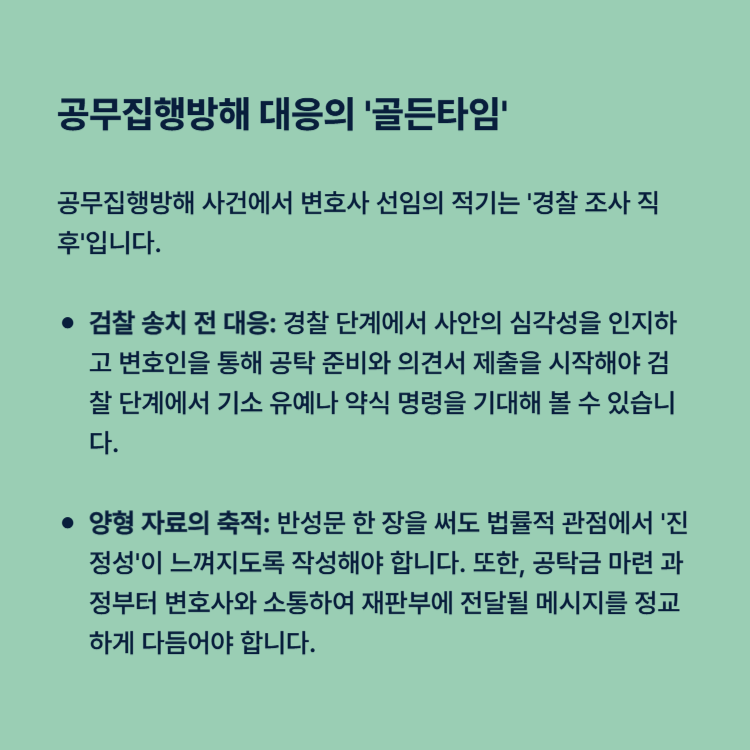 공무집행방해 사건에서 변호사 선임의 적기는 '경찰 조사 직후'입니다.