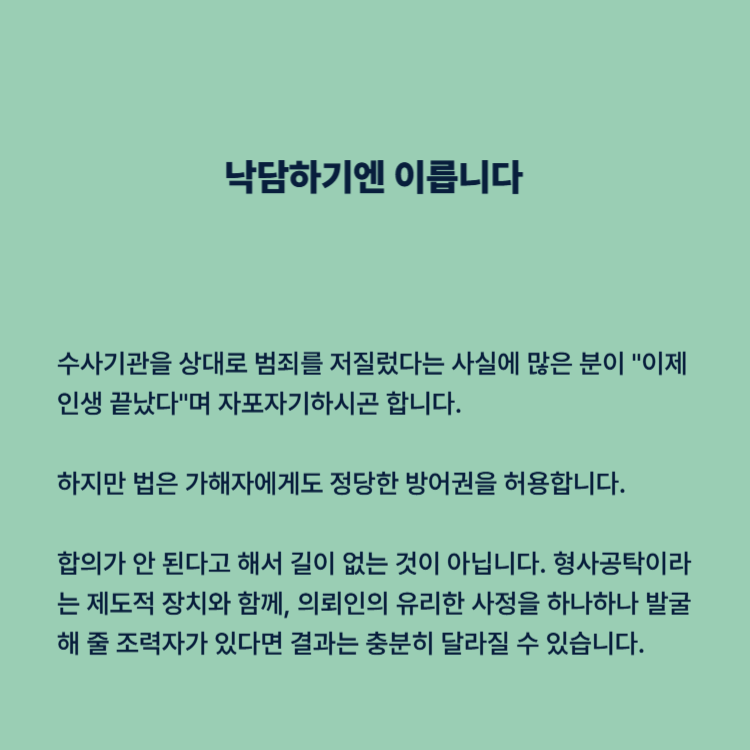 수사기관을 상대로 범죄를 저질렀다는 사실에 많은 분이 "이제 인생 끝났다"며 자포자기하시곤 합니다. 하지만 법은 가해자에게도 정당한 방어권을 허용합니다.