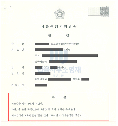 법원은 의뢰인에게 징역 1년, 집행유예 3년의 판결을 선고하였습니다. 다행히 실형 선고를 피한 의뢰인은 그 덕분에 경제활동을 계속하여 가족들을 부양할 수 있었고, 이후로는 자신의 잘못을 반성하고 음주운전을 하지 않고 있습니다.