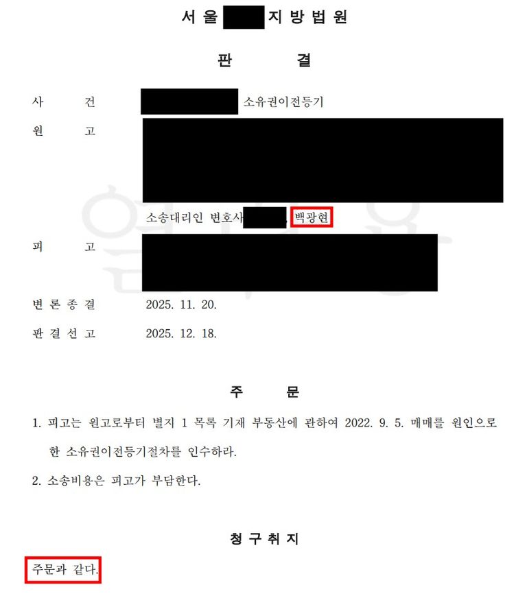 법원에서는 당연히 위와 같이 저희 의뢰인인 원고의 청구를 인용하는 판결을 선고하였고, 이에 따라 원고는 단독으로 피고 명의의 등기를 경료할 수 있게 되었습니다.