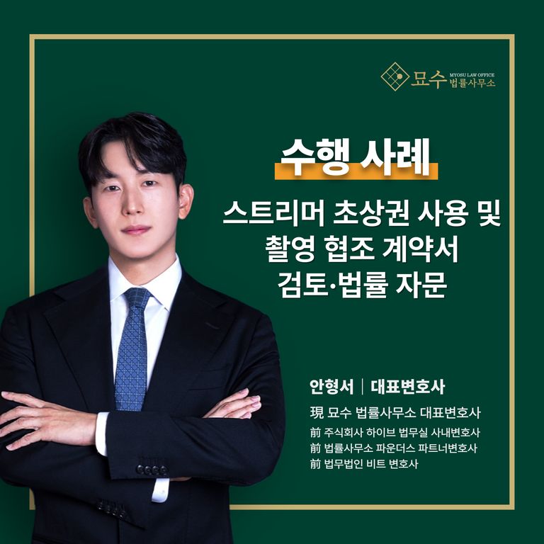 묘수 법률사무소는 스트리머의 초상을 활용해 포토프레임을 제작하려는 과정에서 체결해야 할 초상권 사용 및 촬영 협조 계약서에 대한 검토 및 법률 자문을 수행하였습니다.