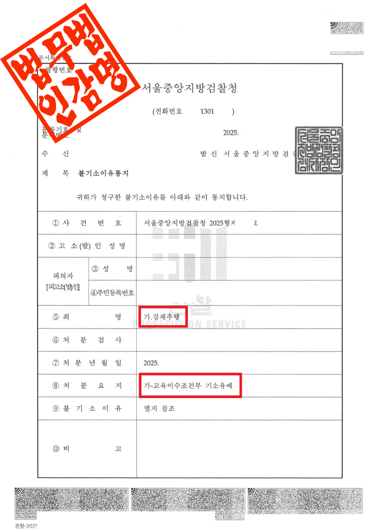 서울중앙지방검찰청은 이 사건에 대해 다음과 같은 사유로 불기소 결정을 하였습니다.