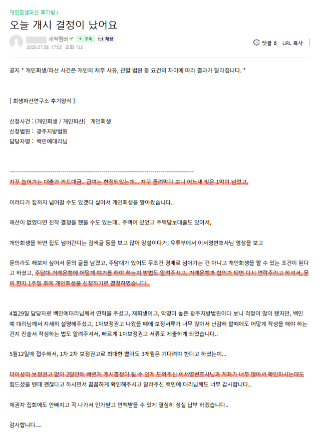 의뢰인은 포기하고 싶은 순간도 많았지만, 아이들을 위해 다시 살아야 했습니다. “두 번 다시 이런 일이 없도록 성실하게 살겠다”는 다짐으로, 개인회생을 신청하게 되었습니다.