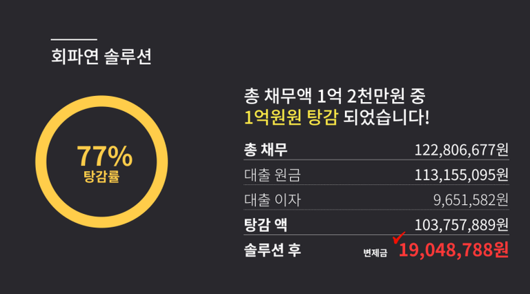 결국 정신적, 신체적으로 지친 의뢰인은 회사를 그만두게되었습니다. 다시 마음을 추스르고 고정 월급을 받을 수 있는 새로운 직장에 정직원으로 취직했지만, 이미 쌓인 빚과 생활비 부담, 신용카드 돌려막기로 매달 허덕이는 생활이 반복됐습니다. 한때는 너무 힘들어 절망적인 생각도 들었지만, 포기하지 않고 빚을 갚으려 다시 힘을 냈습니다.