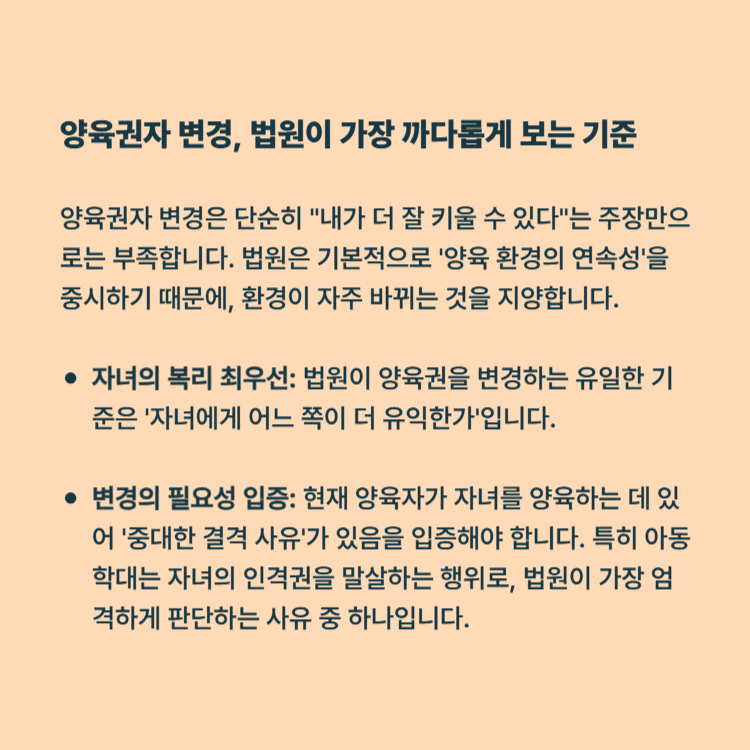 자녀의 복리 최우선: 법원이 양육권을 변경하는 유일한 기준은 '자녀에게 어느 쪽이 더 유익한가'입니다.