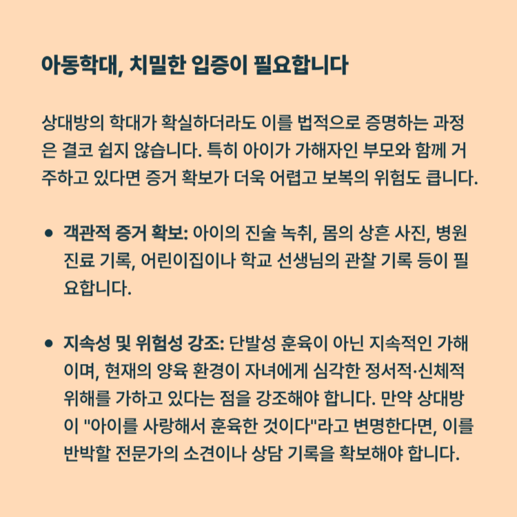 상대방의 학대가 확실하더라도 이를 법적으로 증명하는 과정은 결코 쉽지 않습니다. 특히 아이가 가해자인 부모와 함께 거주하고 있다면 증거 확보가 더욱 어렵고 보복의 위험도 큽니다.