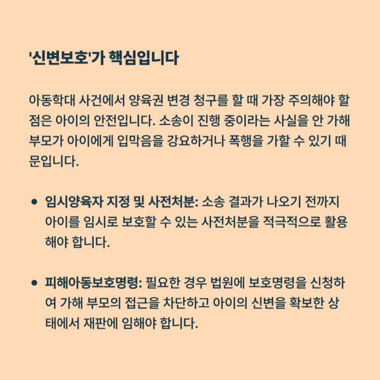 아동학대 사건에서 양육권 변경 청구를 할 때 가장 주의해야 할 점은 아이의 안전입니다. 소송이 진행 중이라는 사실을 안 가해 부모가 아이에게 입막음을 강요하거나 폭행을 가할 수 있기 때문입니다.