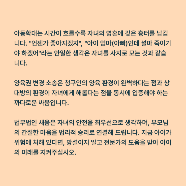 양육권 변경 소송은 청구인의 양육 환경이 완벽하다는 점과 상대방의 환경이 자녀에게 해롭다는 점을 동시에 입증해야 하는 까다로운 싸움입니다. 법무법인 새움은 자녀의 안전을 최우선으로 생각하며, 부모님의 간절한 마음을 법리적 승리로 연결해 드립니다. 지금 아이가 위험에 처해 있다면, 망설이지 말고 전문가의 도움을 받아 아이의 미래를 지켜주십시오.