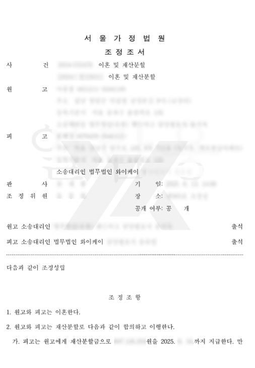 법무법인 YK 이혼 변호사의 조력으로, 의뢰인이 요구하는 조정안이 받아 들여졌고, 해당 합의 내용을 반영하여 조정이 최종 성립되었습니다.