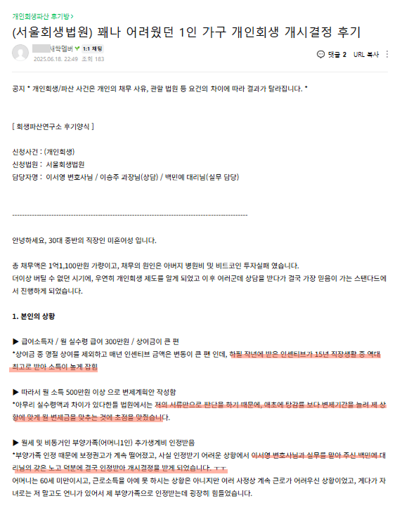 수입보다 지출이 많아지면서 채무를 돌려막거나 예금을 생활비로 쓰는 악순환이 반복되었고, 여러 차례 아르바이트 등으로 상환을 시도했으나 구조적으로 채무가 줄지 않아 결국 지급불능 상태에 이르게 되었고 의뢰인은 개인회생을 신청하게 되었습니다.