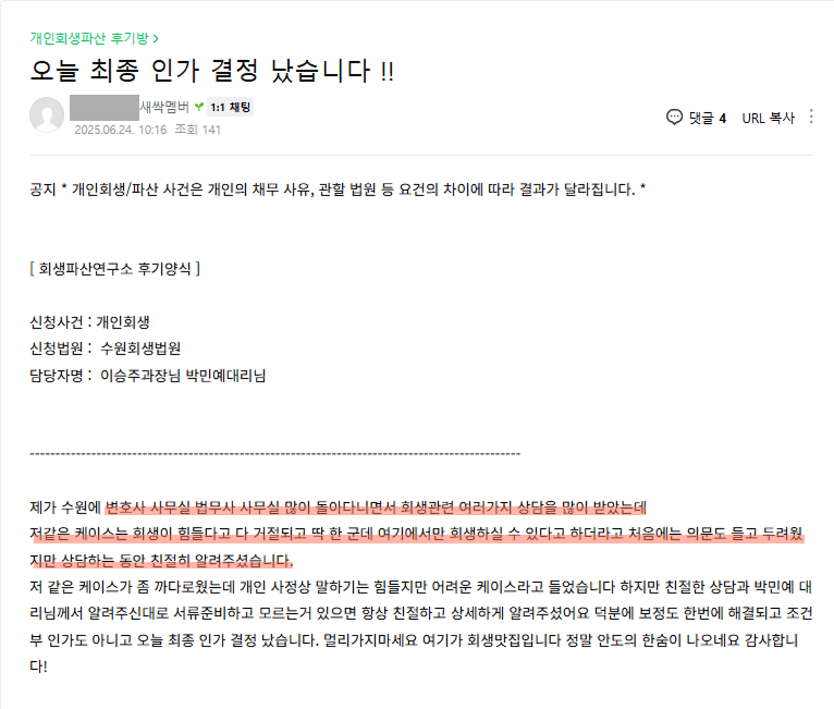 그러던 중, 배달 일을 하던 중 예기치 못한 교통사고를 당해 허리 부상을 입고, 그 후유증으로 불안장애와 우울증이 심해졌습니다. 정신과 치료를 받으면서도 공포감과 두려움에 시달리며 정상적인 근로가 어려워졌고, 수입이 크게 줄어들었습니다. 채무 상환을 위해 최선을 다했지만, 신체적·정신적 고통과 경제적 부담이 겹치면서 더 이상 빚을 감당할 수 없는 상황에 이르렀고 개인회생을 신청하게 되었습니다.