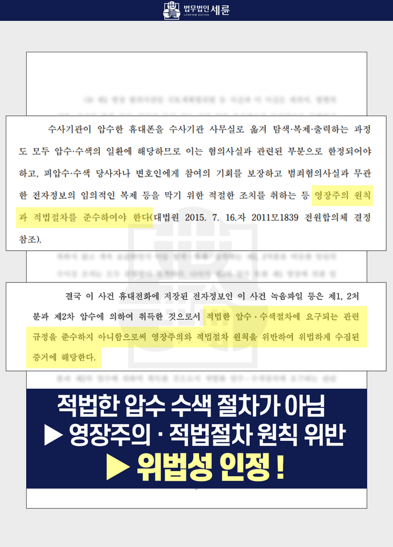 수사기관의 절차적 위반은 피고인의 앞날을 결정지을 수 있는 중요한 부분입니다. 다만 법률적 지식이 없는 분들께는 증거의 위법성을 따지는 것이 어려울 수밖에 없습니다. 조력이 필요하신 분들은 언제든지 세륜에게 연락 주시기를 바랍니다.