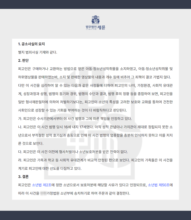 저희 세륜을 찾아주시는 어린 학생들을 보면 단순 장난으로 지인들에게 골탕을 먹이기 위해서, 용돈이 부족해 쉽게 돈을 벌 목적으로 이런 딥페이크 성범죄에 손을 대는 경우가 많습니다. 또는 '미성년자라서 처벌받지 않는다'고 가볍게 생각하여 범죄를 실행하는 경우도 있는데, 미성년자라 하더라도 형사처벌 또는 보호처분을 받을 수 있음을 기억하셔야 합니다.