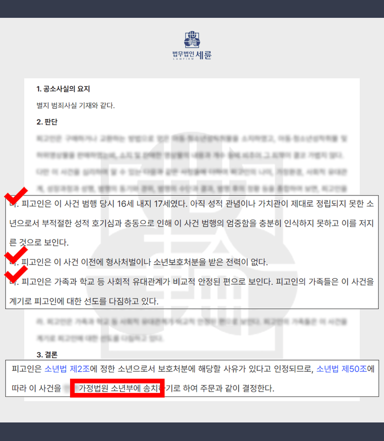 법원은 "소년 A의 나이를 고려하여 교화를 통해 건전한 사회인으로 성장할 수 있는 기회를 부여한다"는 입장을 비치며 형사 처벌은 하지 않고, 소년법에 따라 가정법원 소년부에 송치하기로 합니다. 다행히 형사처벌은 면하게 된 것이죠.