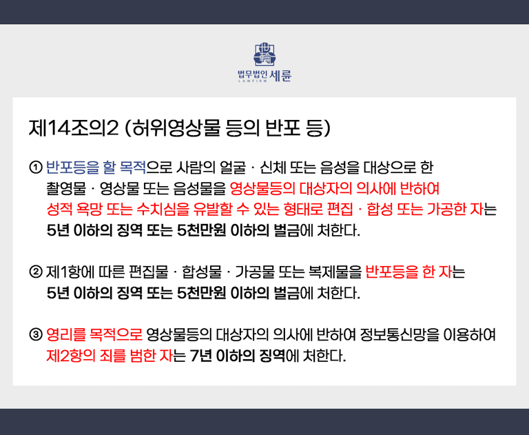 딥페이크를 이용하여 성범죄를 저지르는 경우 처벌하는 규정이 따로 없어 공백이 있던 중 2020년 성폭력처벌법의 개정으로 그 처벌을 명시하게 됩니다. 성폭력처벌법 제14조2의 제1항에 따르면 반포할 목적으로 사람의 얼굴, 신체, 음성을 대상으로 한 촬영물, 영상물, 음성물을 대상자의 의사에 반하여 성적 욕망 또는 수치심을 유발할 수 있는 형태로 편집, 합성 또는 가공한 자는 5년 이하의 징역 또는 5,000만원 이하의 벌금에 처하도록 하고 있습니다.