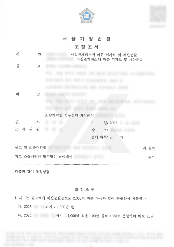 조정기일에서는 의뢰인과 상대방의 유책사유 및 기여도를 적극적으로 다투어, 최종적으로 위자료는 없는 것으로 하고 재산은 최소한으로 분할하면서도 그 중 일부는 내년부터 지급할 것을 내용으로 조정하였습니다.