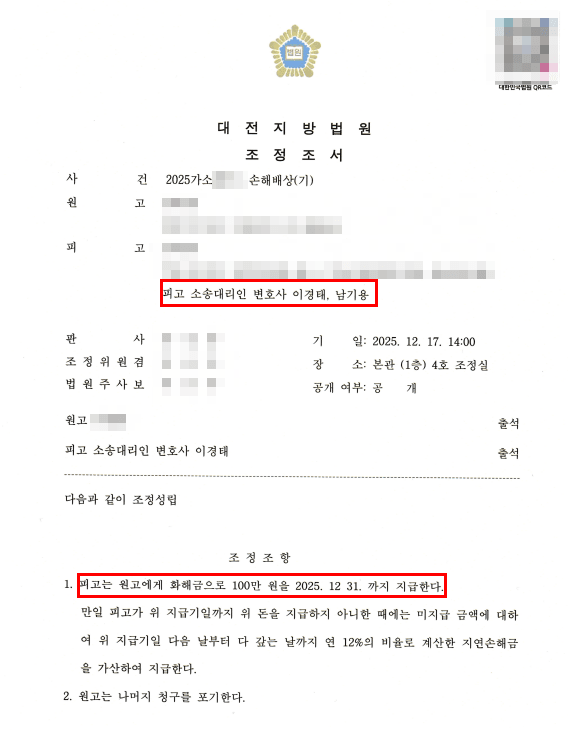 의뢰인의 수차례 회의를 통해 대응전략을 수립하여 원고 청구 금액의 1/28에 해당하는 100만원으로 조정 성립하였습니다.