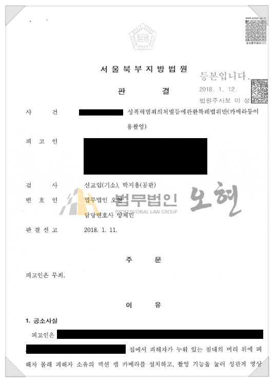 법원은 담당 변호인의 주장을 그대로 인용하며 의뢰인에게 무죄를 선고하였습니다. 나아가, 변호인이 제출한 증거자료로 의뢰인의 억울함이 명백히 밝혀진 탓인지, 담당 검사는 무죄 판결이 이루어졌음에도, 항소를 하지 않았습니다.