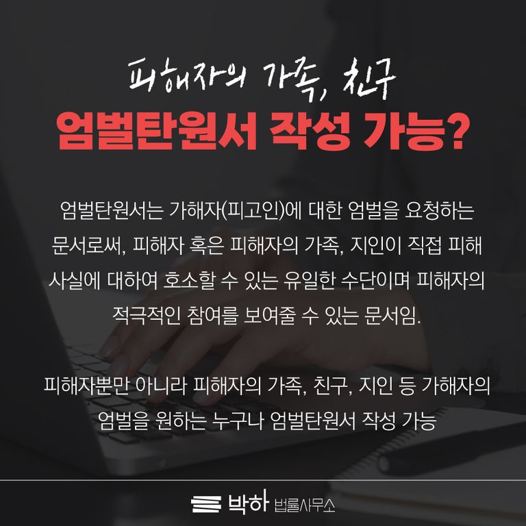 오늘은 피해자의 가족 혹은 친구 등 지인분들이 엄벌탄원서를 작성하는 법에 대하여 알아보도록 하겠습니다.