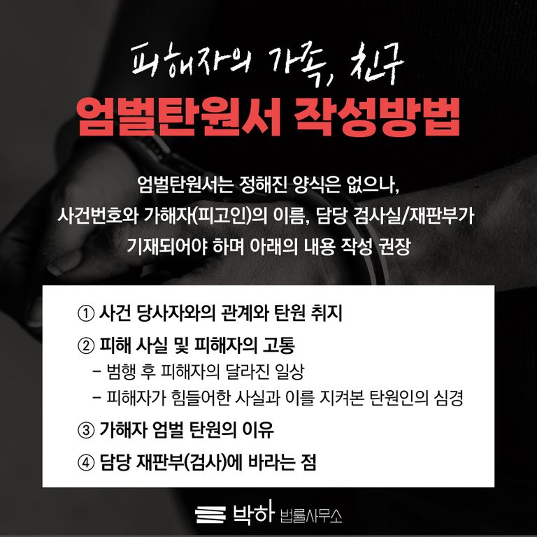 오늘은 피해자의 가족 또는 친구 등 지인이 엄벌탄원서를 작성하는 법에 대해 알아보았습니다.