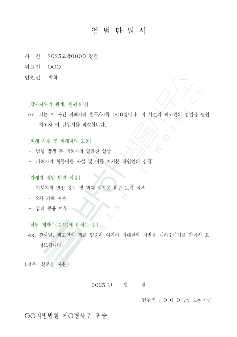 피해자뿐만 아니라 피해자의 가족, 친구, 지인 등 가해자의 엄벌을 원하는 누구나 엄벌탄원서를 작성하실 수 있으며,