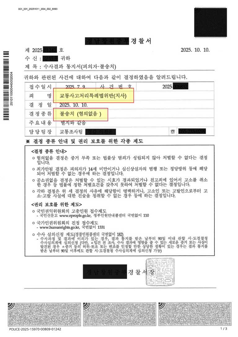 교통사고처리특례법위반(치사) 사건을 경찰 조사단계부터 적극 변론을 진행하여 무혐의 받은 사례