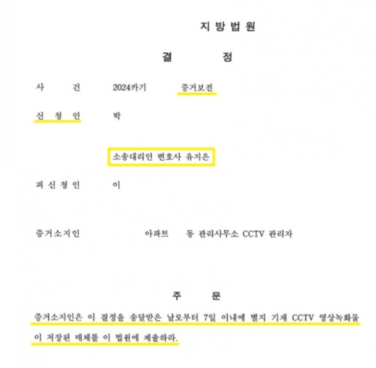 다행히 네비 검색기록을 복구하여 아내가 방문한 아파트 동을 확인할 수 있었고, 관리사무소에 아내가 상간남 집에 방문한 것으로 추정되는 날짜와 시간을 특정하여 아파트 출입구, 현관 및 엘리베이터 앞과 내부 CCTV 녹화영상에 관하여 증거보전 신청을 하였습니다.