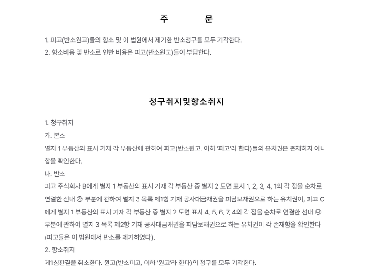 법원은 피고들의 유치권이 존재하지 않는다고 판단하여 원고의 본소청구를 인용하고, 피고들의 항소와 반소청구를 모두 기각했습니다.