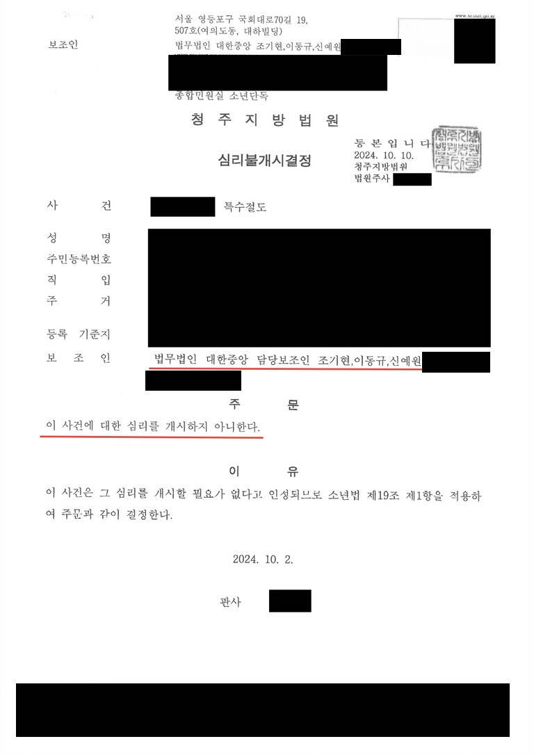 그 결과 재판부는 이동규 변호사의 주장을 모두 인정하여 심리를 개시하지 않기로 하는 심리불개시 결정을 내렸습니다.