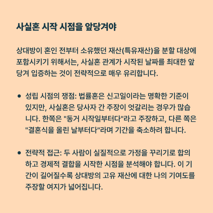 전략적 접근: 두 사람이 실질적으로 가정을 꾸리기로 합의하고 경제적 결합을 시작한 시점을 분석해야 합니다. 이 기간이 길어질수록 상대방의 고유 재산에 대한 나의 기여도를 주장할 여지가 넓어집니다.