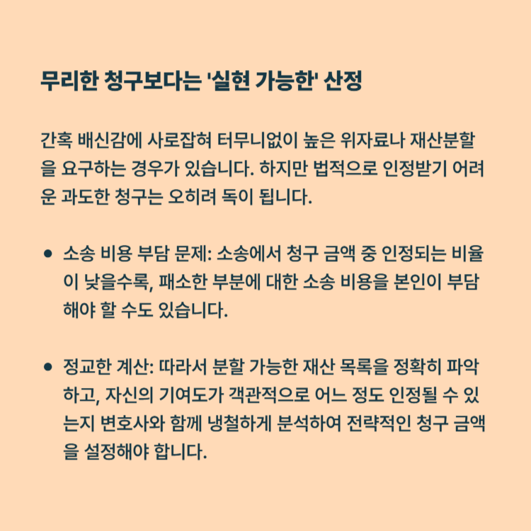 간혹 배신감에 사로잡혀 터무니없이 높은 위자료나 재산분할을 요구하는 경우가 있습니다. 하지만 법적으로 인정받기 어려운 과도한 청구는 오히려 독이 됩니다.