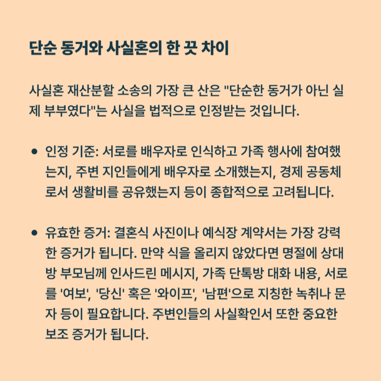 유효한 증거: 결혼식 사진이나 예식장 계약서는 가장 강력한 증거가 됩니다. 만약 식을 올리지 않았다면 명절에 상대방 부모님께 인사드린 메시지, 가족 단톡방 대화 내용, 서로를 '여보', '당신' 혹은 '와이프', '남편'으로 지칭한 녹취나 문자 등이 필요합니다. 주변인들의 사실확인서 또한 중요한 보조 증거가 됩니다.